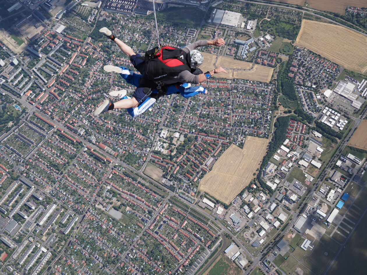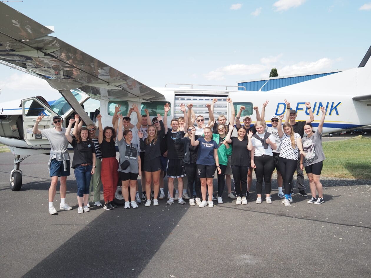 Bevor es in die Höhe ging, gab es eine Einweisung, wie man sich im freien Fall und bei der Landung bewegt. Kurz darauf ging es schon los und die mutigen Springer:innen stiegen ins Flugzeug, um in 4.000 Metern Höhe auszusteigen. Allein ist aber niemand gesprungen, sondern mit einem erfahrenen Tandemmaster an der Seite. Nach 2.500 Meter freiem Fall zog dieser im wahrsten Sinne des Wortes die Reißleine. Die letzten 1.500 Meter verliefen zwar etwas langsamer, aber nicht weniger spektakulär. Bei schönem Ausblick wurden noch die ein oder andere Drehung gemacht, bei denen auch unsere Azubis mal das Steuer in die Hand nehmen durften.