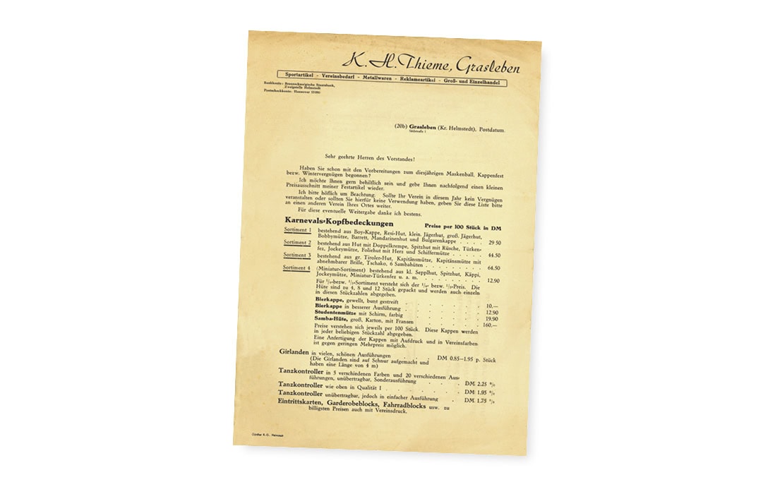 1 Jahr nach der Gründung veröffentlicht Karl-Heinz-Thieme das erste Werbeblatt, das die Grundlage für die spätere Entwicklung umfangreicher Produktkataloge bildet.